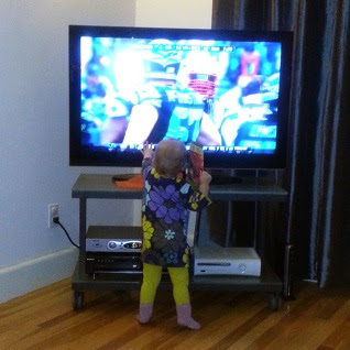 The commentary: The only thing more brutal than this game was being apart from my wife and daughter in the week leading up to it. After returning from Florida, A. stayed behind in Connecticut to work from her parents’ house while they took care of G. during the day. Back in Massachusetts, I droned between work and home and was in bed by ten every night, except for that one long outing to Deep Ellum in Allston (cab fare to North Station for the midnight train home: too much). I missed them terribly. G. snapped right into football mode upon returning—here she is trying to high-five Brandon Spikes after he stuffed Marshawn Lynch for a loss.