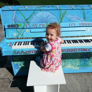 After breakfast at Flour, where G. devoured an egg sandwich and made eyes with a friendly old haberdasher or statistician or something, we walked along the missing shadow of 93 and found one of the whimsical “Play Me, I’m Yours” pianos scattered about the city (a series of public art installations). A. and I temporarily got over our fear of germs and plopped G. right onto the devil’s bench, stepped back and listened to her bash out a passable version of “The Court of the Crimson King.” Impressive talent! Impressive parenting.