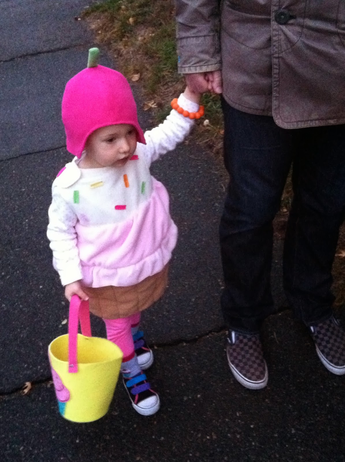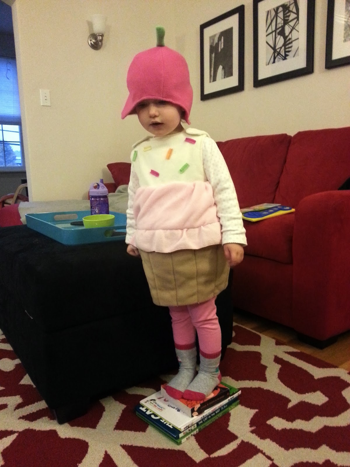 Guess who dressed as a cupcake? Ever seen one balance on a stack of books? OK, so it’s not completely unexpected. At least we got her a costume this year. Check out the home-grown photography in the background: of the three framed pictures, A. took the middle (the Alcatraz water tower’s spiral staircase); I took the one you can’t see (some beautiful trees on St. Lucia, where we honeymooned… and honestly my favorite print of the three); and neither one of us will take credit for the unfinished Bermuda church at left. We’re each convinced the other snapped it. Anyway, that’s our display. Bidding queue forms to the left.