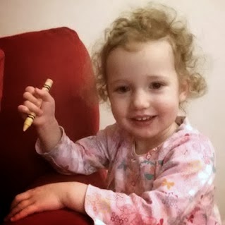G. was in rare form Sunday. No nap! She kept asking to watch the Patriots because I told her that’s what we’d do together when she awoke but that means nothing when there’s no sleep in the first place. So I flipped between the early games (Vikings–Bengals and Broncos–Texans; and no, I don’t remember such a spectacle upon Brady setting an individual record either) to keep her happy while she colored on the wall, on the table, on the floor, on the pillow and even on her construction paper a little bit. Well done, dad. I captured—barely—a rare respite by luring her in with the front-facing camera. That’s why it sort of looks like crap… sorry for the blur, internet. You see how ready she is with that crayon? “Yellow!” She’s excelling in the fan department though: at one point I asked her to yell “Go Patriots!” and she complied with “Go Patriots! One more time, go Patriots!” That’s not me interjecting there, she actually said “One more time” and then repeated “Go Patriots!” Her enthusiasm and wonderful warm hugs are all I need to get through any looming playoff disasters. Not that I’m pessimistic. Really.