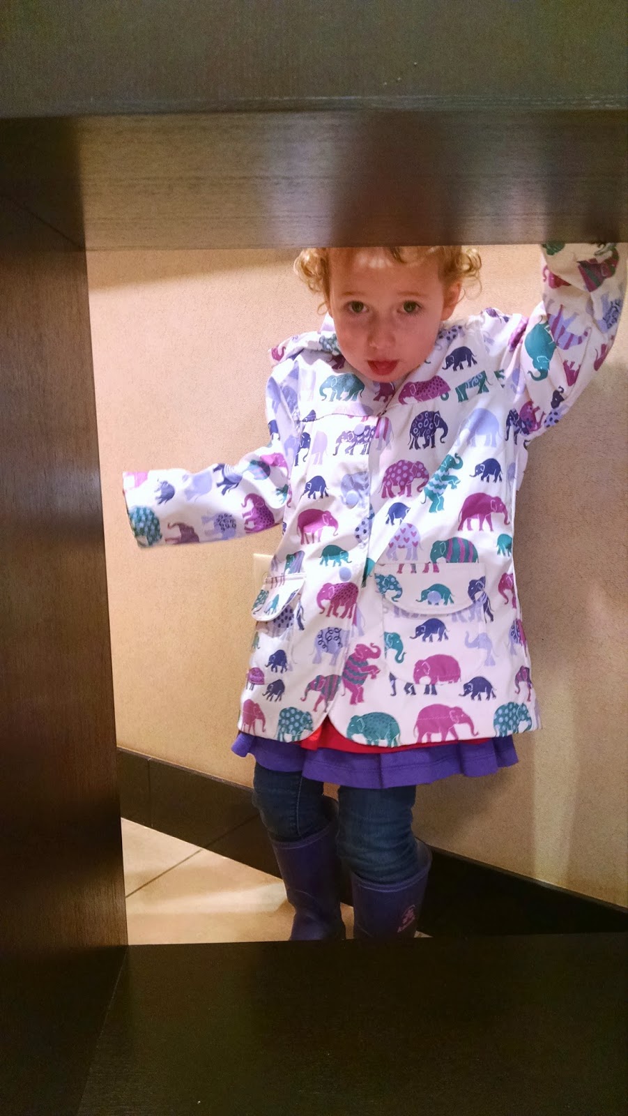 Lastly, here’s our rainy-day princess frolicking around some furniture at the mall. A. and I were snapping pictures as she protested “Stop looking through my window!” This was during our wait for the family bathroom to become vacant so G. could use the potty. The lone middle-aged man who eventually showed himself (after several flushes) had dropped a giant, stinking shit bomb on the entire zip code. Happy Halloween, you monster you. Let’s find another bathroom.
