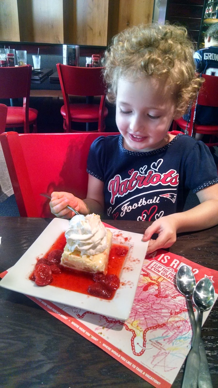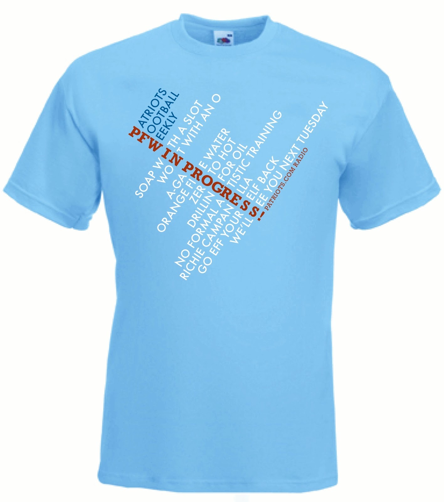 The above dessert was enjoyed at Gillette Stadium’s Red Robin. I always thought it was a take-out burger joint but it also doubles as the only affordable restaurant within the Kraft Kompound (last year’s Olive Garden and its authentic, straight-from-Palermo cuisine was a tad overpriced). To my surprise they had a decent beer selection (the Rebel IPA is nice), red balloons that hold their helium for days and weekend dads at the next table who put their phones down long enough to order a Whales Tale and then revert to Coors Light when the waitress says they’ve run out. The pro shop set me back a few bucks once G. spotted new family member “Huggle Buggle Bear,” a hot pink bear in a Pats shirt that has already been stripped off. It was inevitable. I’m still looking for the simple “XXXVI XXXVIII XXXIX XLIX” shirt the waitress was wearing. Drag. Hey, speaking of shirts, PFW in Progress is jerking us around by claiming to choose from submitted designs for a shirt of their own. Here’s my entry, followed soon by one that reads “Hey Fred, how’s that bullshit shirt contest coming along?”
