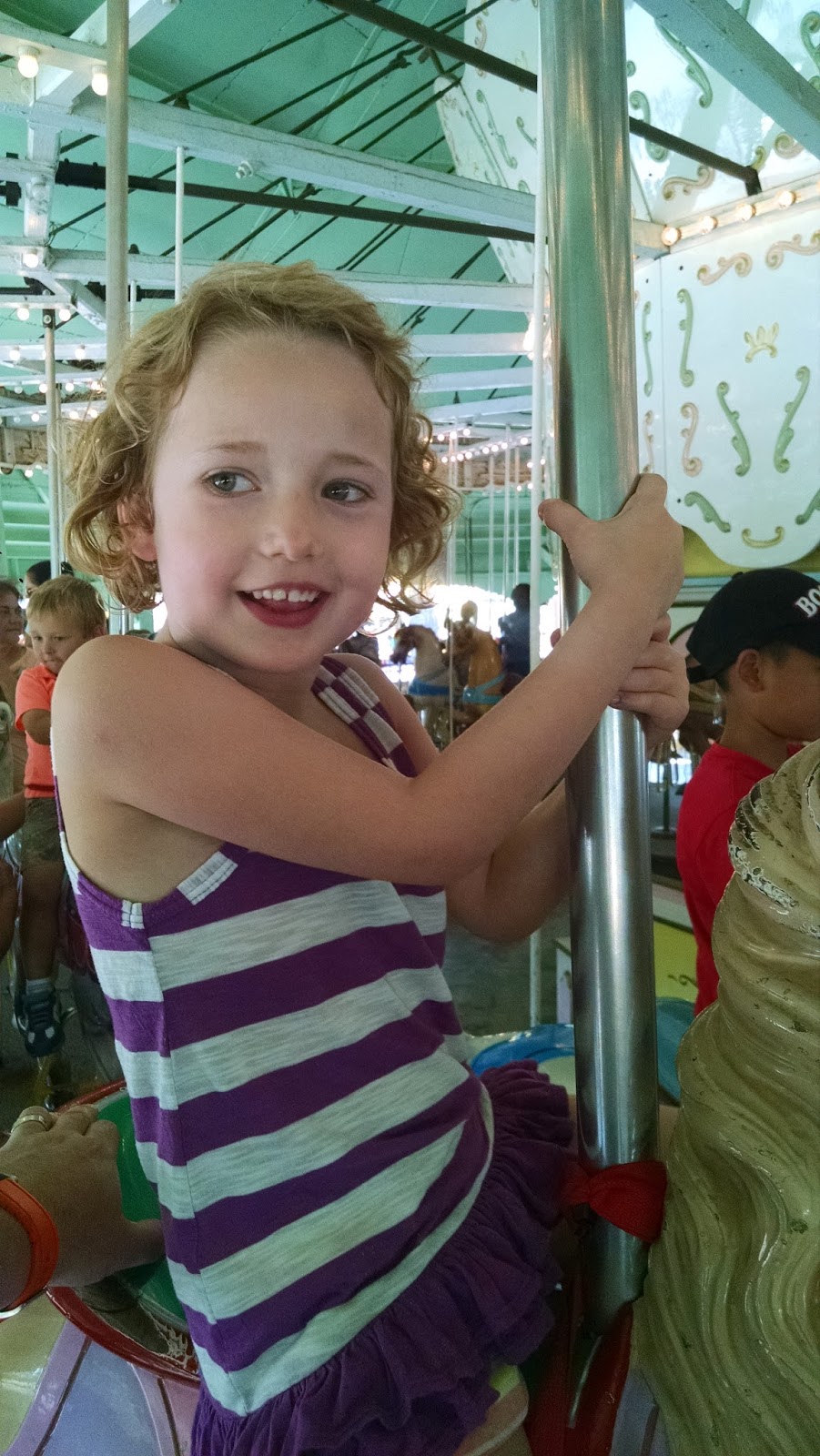 You bet we rode the carousel first! And second and third. G. was more interested in looking at the outside of the haunted “Mine of Lost Souls” ride than anything else, asking over and over if and how it was really scary. I spoke of animatronics, jump scares and strobe lights but needn’t have said so much—I had her at animatronics after a dancing Santa Claus scared the bejesus out of her a few Christmases ago. Still she was fascinated, and after awhile I suggested we move on, noting we could come back for the 3:30 magic show next door if she wanted. We retreated to the carousel for a couple more rides (four and five) and then I suggested the Ferris wheel, which was a big hit. She’ll be ready for those lost souls in no time.