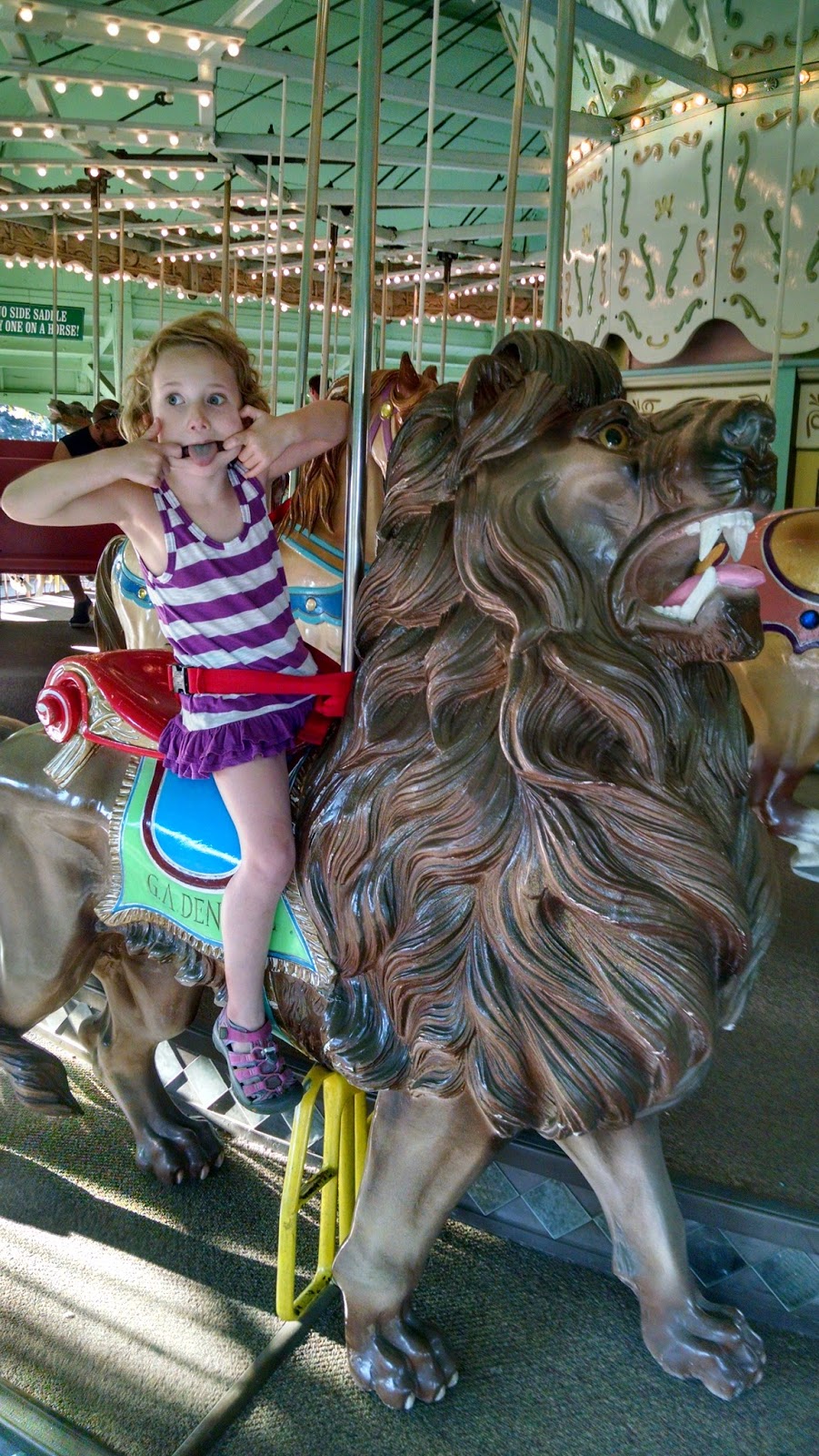 Lunch was next, followed by a train ride around the park that took way too long. I begged her to hop off halfway through but she wasn’t having it. Eventually (mercifully) it ended in time to grab popcorn before catching the magic show in which I participated (and will reveal no secrets) to G’s delight. Though it might have been the popcorn. Another few loops on another purple Ferris wheel car and then three more rides on the carousel, on her own (!) on a stationary lion once because she really wanted to sit on that lion. Ups and downs are overrated sometimes.