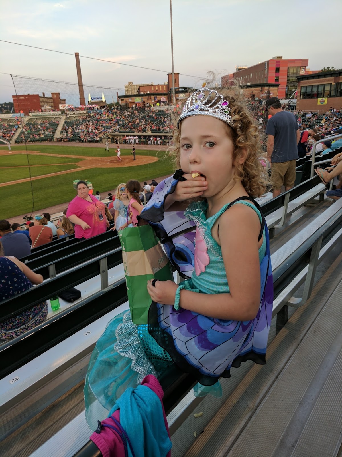 A month later I took a… butterfly mermaid?… to “Daddy Daughter Princess Night” with the Lowell Spinners, an A-level Red Sox outfit. Who doesn’t love visiting Lowell? It was a fun night capped off by a costumed Princess Jasmine’s bosom and a fairly spectacular fireworks display, both (all three?) of which approached a kind of danger. An earlier snafu at the box office left a bitter taste, though, as I had the audacity to request a seat next to my daughter—by the time everything was sorted I’m sure the guy behind the glass hated me as much as I did him. Good luck with your ticket-distribution career, failed hipster meathead.