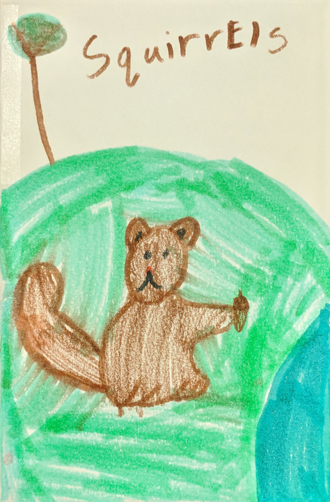 G. has taken to writing and illustrating her own All About series. All About Trees, All About Birds, etc., generally devoting each page to a stage of the subject’s lifecycle or segment of its physiology. Seed/sprout/leaf/branch and egg/“hatches”/chick/grown-up chick, right? Thorough and informative! Here’s what you can expect with All About Squirrels—typos and cross-outs are the author’s. Page 1: “Squirrels are kute cute. Squirrels are fussie and flufie of cors. But they do not cuddal in your lap.” Page 2: “Squirrels are brown and have a bushie tail. They live in trees too.” Page 3: “Squirrels eat penuts and other things too.” Page 4: “Also by G.” followed by thumbnails of existing or forthcoming books in the series: