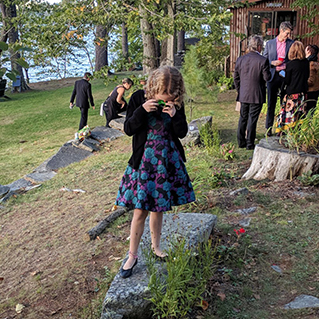 A grounded canoe full of iced Peak Organic solves everything, even if it’s also full of Budweiser and LaCroix. And disposable cameras, distributed to all of the children in attendance (quite a few), allowed for adult conversations that weren’t constantly interrupted by requests to play bocci and cornhole (“Daddeee, come on!”). I don’t know if the things will be developed and shared but G. documented all area flowers, mushrooms and spider webs thoroughly. Later, during the self-serve-wine (and lodge-artwork-critique) portion of the evening, Aladdin started up on a corner TV and G. was occupied for another ninety minutes. Afterward we convinced her to dance with us for a bit—just not in time for “Walk on the Wild Side” “Can I Kick It?”—before hitting the road. We even saw a raccoon on the way to the hotel. The night was a success.