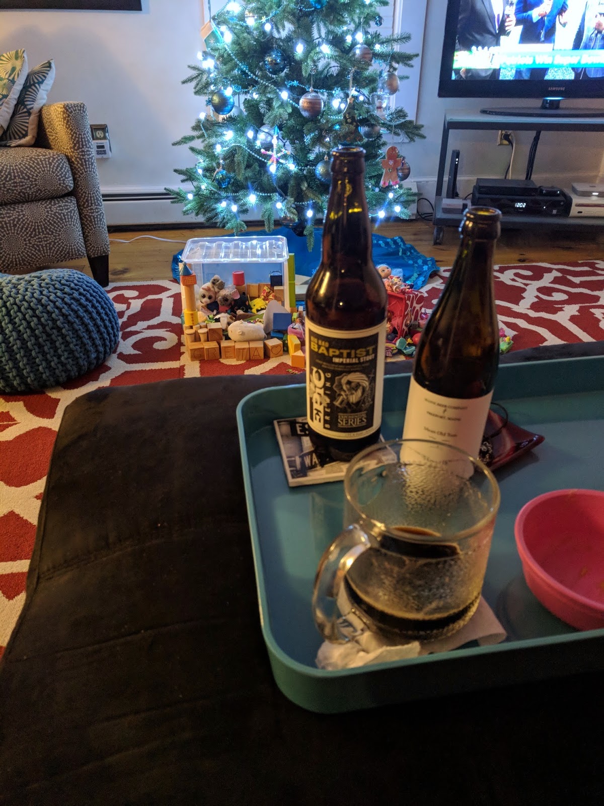 Merry Christmas! The imperial stout was good, if I remember right, and it had better be at eleven-plus percent alcohol. I even rounded it off with a Mean Old Tom afterward, held over from the AFC Championship game, to get me through hours of postgame “BREAKING NEWS: PATRIOTS WIN SUPER BOWL!” crawls on the local news. Taking February 4 off was a good idea.
