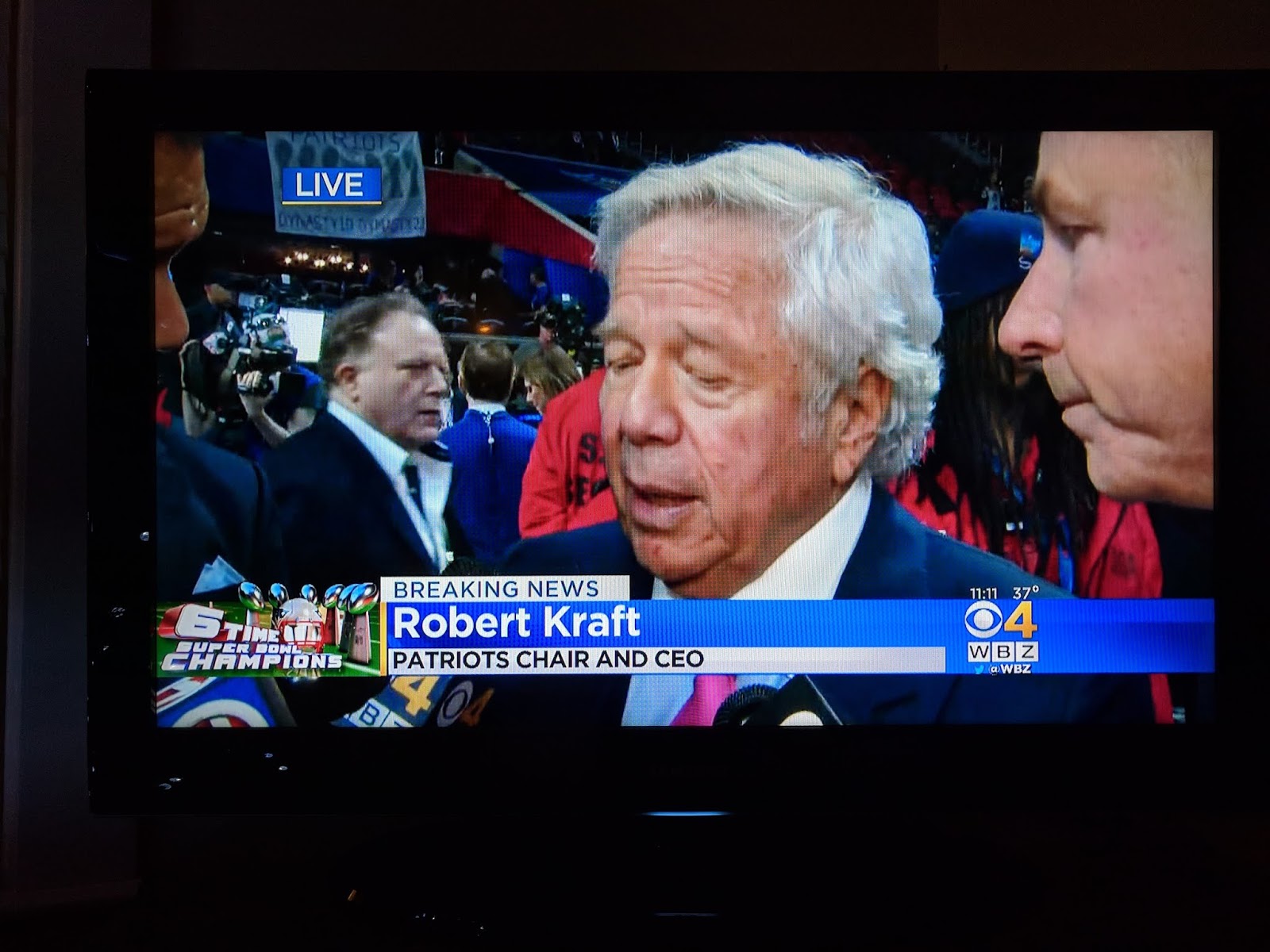 Sighting! It wouldn’t be a Super Bowl recap if I didn’t photograph the TV. Here’s PFW in Progress Patriots Unfiltered hero Fred Kirsch making a post-victory cameo behind the team’s disgraced owner. “Sexual Dussault” for the win.