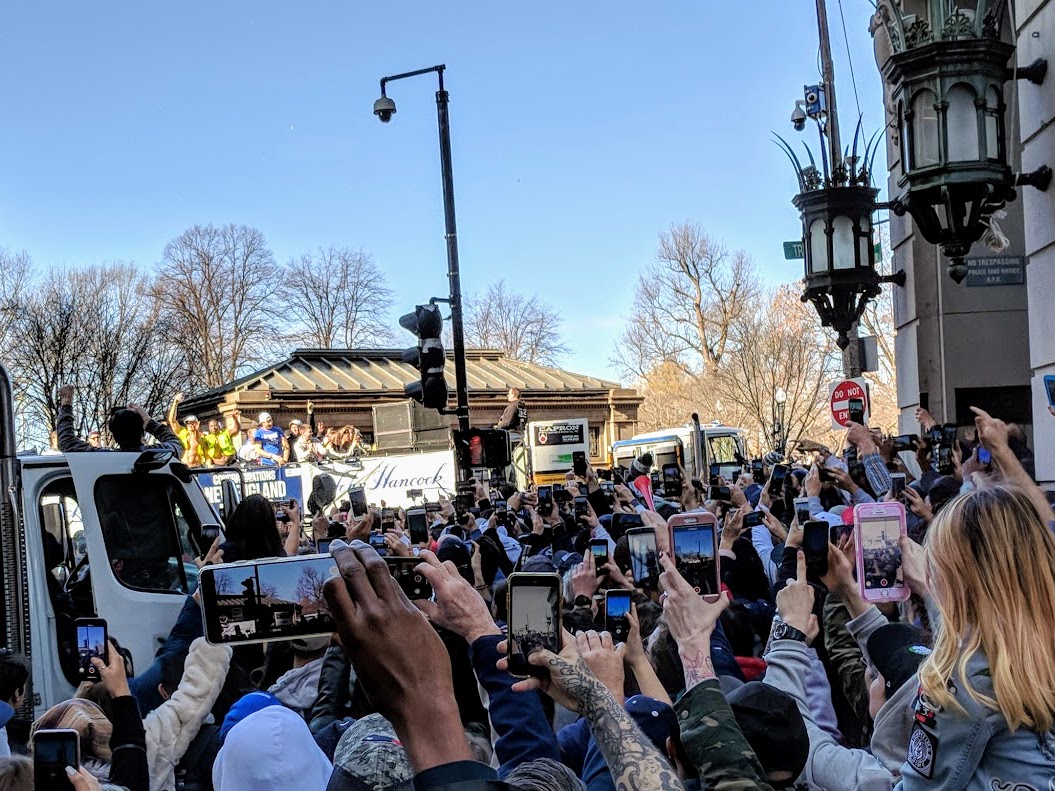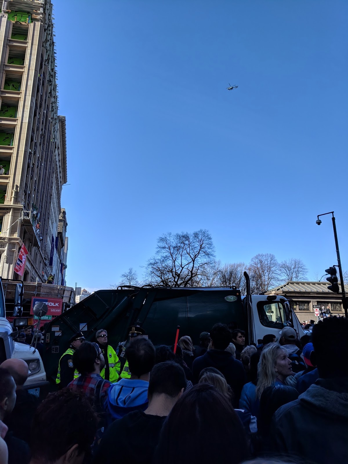 I did go to work on Tuesday, if you can call ducking out for two hours at lunchtime to attend the parade “going to work.” I outsmarted everyone but cutting through Chinatown to the corner of Essex and Tremont so I could watch each individual duck boat cruise toward me down Boylston on a beautiful sunny afternoon. Instead a fucking dump truck served as a large, obstructive indicator for the duck-boat drivers to not, you know, plow into the crowd. Bitchin view from the copter though.